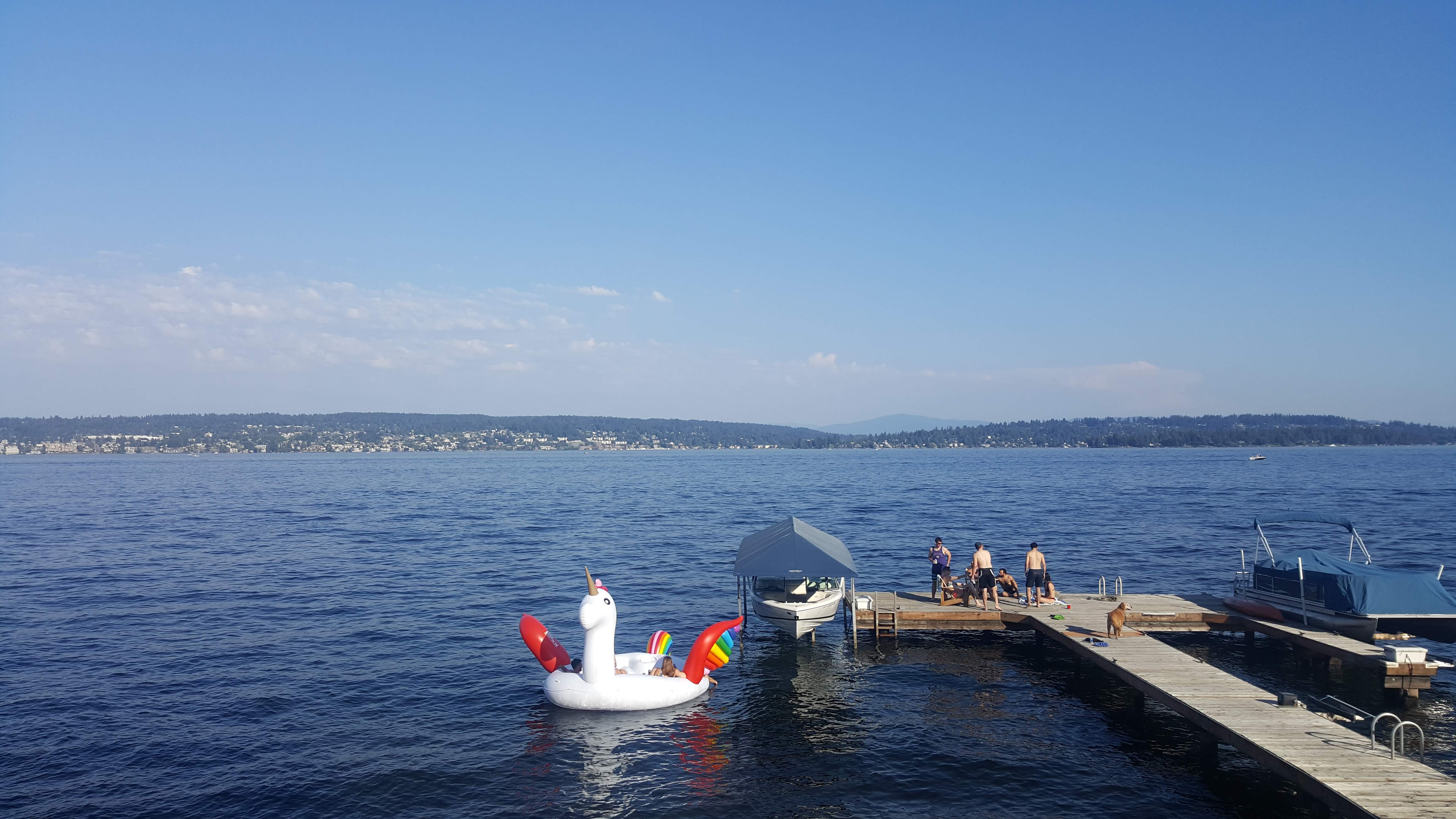 Après une entrée dans Seattle un peu difficile (le « daily commute » semble être un problème ici, avec une circulation routière très dense), me voilà arrivée avec plus d’1 h 30 de retard. Mais bon, je suis chanceuse puisque mon ami est venu directement me chercher au terminal des bus. A peine dans la voiture, il me propose « Ca te dit d’aller chez un de mes potes ? ». Hop, ni une, ni deux, nous voilà en route. Et ça valait le coup de ne pas être asociale ! La maison des parents de cet ami était vraiment magnifique : idéalement située au bord du lac Washington, avec un beau jardin, et surtout, un ponton qui mène directement au lac… et à une bouée licorne géante. J’avais un peu du mal à réaliser où j’étais à vrai dire, entourée d’américains de mon âge, en train de me baigner dans ce super lac… Mais ravie de vivre une expérience hors des sentiers touristiques !
