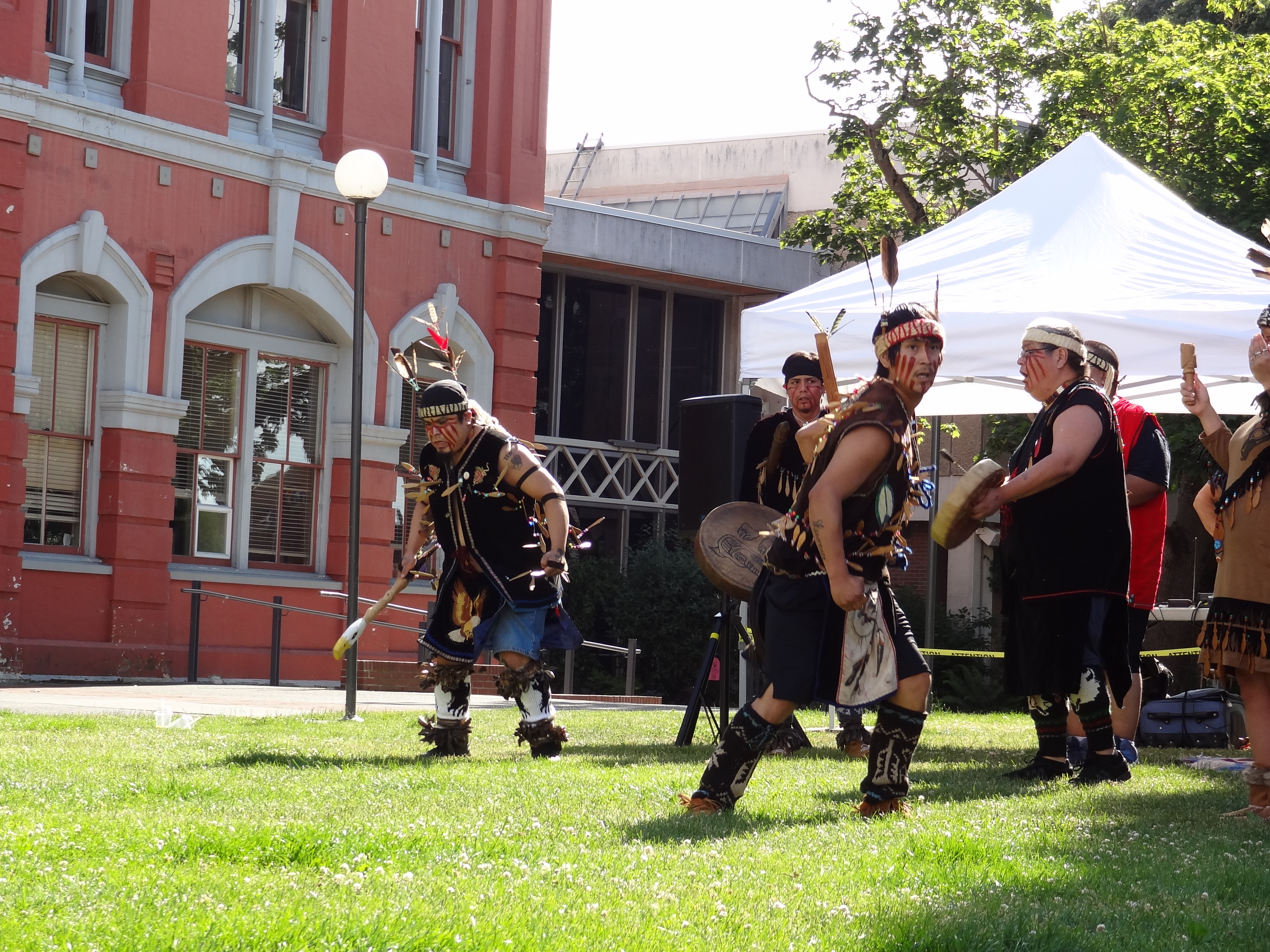 La traversée (1 h 30 environ) fut agréable, j’ai eu de la chance pour la météo. Un petit pique-nique au soleil sur le pont, et me voilà arrivée à destination. Enfin presque, comme souvent les embarcadères sont un peu en dehors des villes, et il faut donc prendre un bus pour arriver au cœur de la ville. Ce dernier m’a déposée à quelques mètres à peine de mon auberge de jeunesse à Victoria, l’Ocean Island Inn Backpackers Hostel. Victoria est la ville principale de l’île de Vancouver, et est aussi la capitale de la région à laquelle appartient Vancouver, la Colombie-Britannique. L’arrivée à l’auberge s’est faite dans la bonne humeur : staff sympa, et j’ai tout de suite sympathisé avec un Américain dont je reparlerai un peu plus tard. Une fois mes affaires installées dans le dortoir, j’ai décidé d’aller me promener un peu dans les rues alentour. Bien m’en a pris, puisque j’ai eu la chance de tomber sur un festival : une rue complètement piétonne, remplie de stands d’artisans, de nourriture, des concerts, des danses traditionnelles des tribus amérindiennes… Un bon moyen de se sentir bienvenue dans la ville.